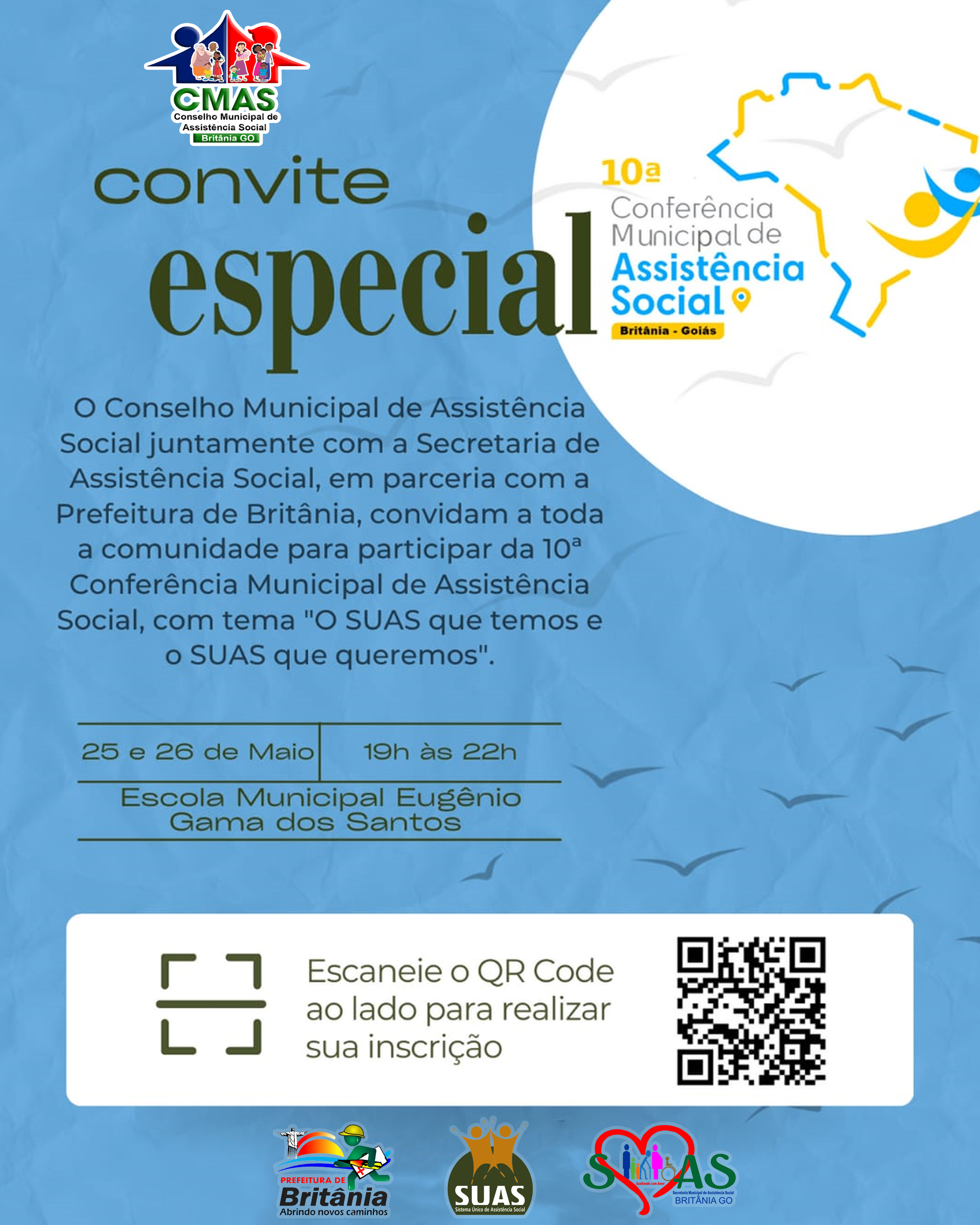 O CONSELHO MUNICIPAL DE ASSISTÊNCIA SOCIAL, em parceria com a Prefeitura de Britânia e a Secretaria Municipal de Assistência Social, convidam à toda a população para participar da 10ª Conferência Municipal de Assistência Social, que acontecerá nos dias 25 e 26 de maio de 2023, das 19 às 22 horas, na Escola Municipal Eugênio Gama dos Santos.