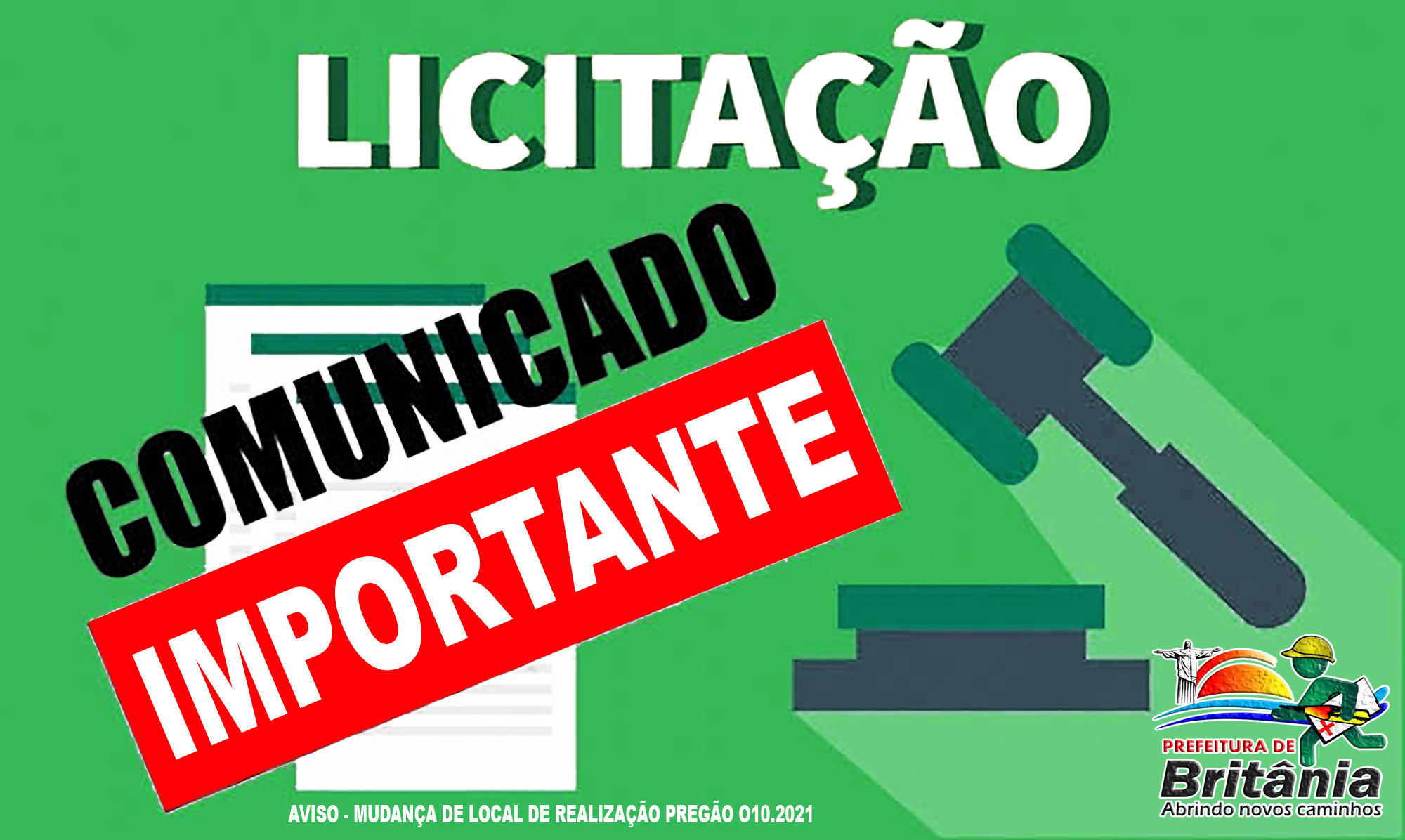 A Prefeitura Municipal de Britânia GO, COMUNICA que acontecerá a MUDANÇA DE LOCAL DA LICITAÇÃO DO PREGÃO PRESENCIAL Nº 010/2021.