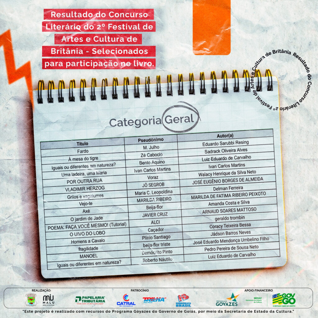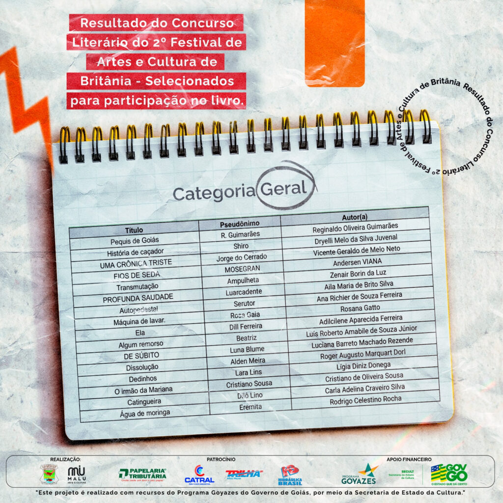 CONCURSO LITERARIO 2º FESTIVAL DE ARTES E CULTURA BRITÂNIA – CATEGORIA GERAL – SELECIONADOS PARA PARTICIPAÇÃO NO LIVRO
