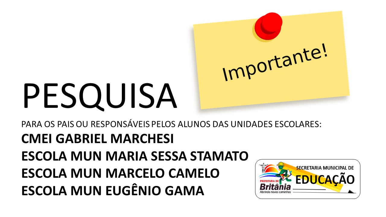 Prezados Pais ou Responsáveis, a Secretaria Municipal de Educação de Britânia–GO gostaria de saber a sua opinião a respeito do possível retorno das aulas presenciais no município. O seu preenchimento é muito importante!
