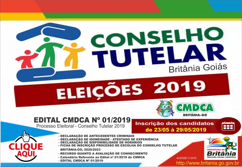 A PRESIDENTE DO CONSELHO MUNICIPAL DOS DIREITOS DA CRIANÇA E DO ADOLESCENTE – CMDCA DE BRITÂNIA-GO, Thays Catriny Morais de Moura Almeida, no uso de suas atribuições legais, torna público, com base na Lei Federal nº 8.069/1990-Estatuto da Criança e do Adolescente, de 13 de julho de 1990, pela Lei Municipal de Política de Atendimento dos Direitos da Criança e do Adolescente nº 002/97 de 23 abril de 1997, alterada pela Lei municipal nº 325/2015 de 15 de outubro de 2015, e Decreto Municipal nº 107/2019, o edital do Processo de Escolha Unificado dos Conselheiros Tutelares de Britânia-GO mandato 2020/2023, aprovado pela RESOLUÇÃO Nº 012/2019, do CMDCA local.