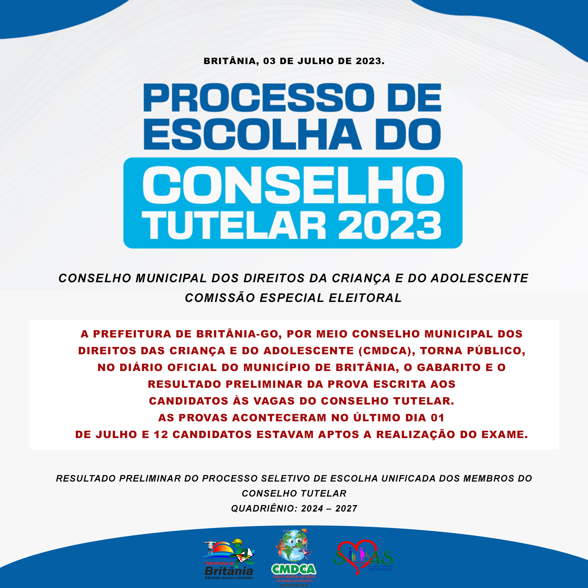 (CMDCA), torna público, no Diário Oficial do município de Britânia, o gabarito e o resultado preliminar da Prova Escrita aos candidatos às vagas do Conselho Tutelar.