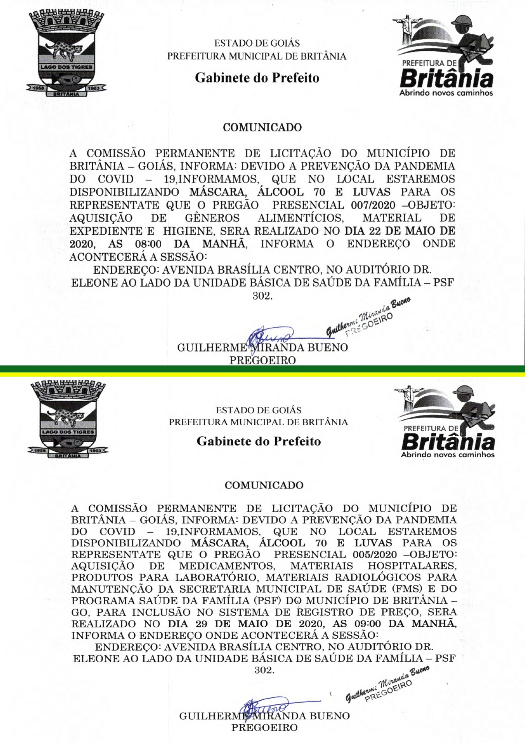 A COMISSÃO PERMANENTE DE LICITAÇÃO DO MUNICÍPIO DE BRITÂNIA – GOIÁS INFORMA: DEVIDO A PREVENÇÃO DA PANDEMIA DO COVID-19, INFORMAMOS QUE NO LOCAL ESTAREMOS DISPONIBILIZANDO MÁSCARA, ÁLCOOL 70 E LUVAS PARA OS REPRESENTANTES, QUE O PREGÃO PRESENCIAL 007/2020 – OBJETO: AQUISIÇÃO DE GÊNEROS ALIMENTÍCIOS, MATERIAL DE EXPEDIENTE E HIGIENE, SERÁ REALIZADO NO DIA 22 DE MAIO DE 2020, ÀS 08:00 HORAS DA MANHÃ, NO SEGUINTE ENDEREÇO: AV. BRASÍLIA – CENTRO, NO AUDITÓRIO Dr ELEÔNE LUIZ DE SOUZA (Ao lado da UNIDADE DE SAÚDE – UBSF 302).