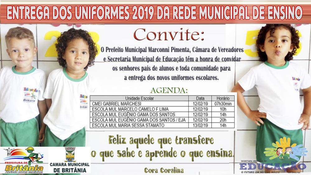 O Prefeito Marconni Pimenta, Câmara de Vereadores e Secretária Municipal de Educação têm a Honra de convidar os senhores pais de alunos e toda comunidade para participar da cerimônia de entrega dos novos uniformes 2019 para os alunos da rede de ensino fundamental.
