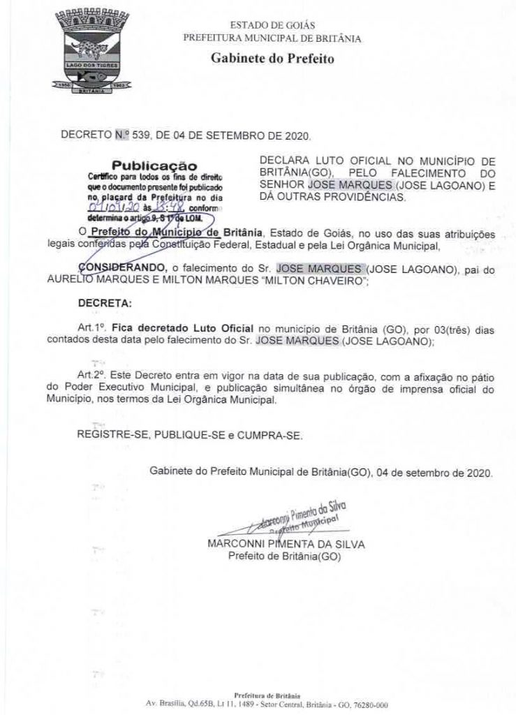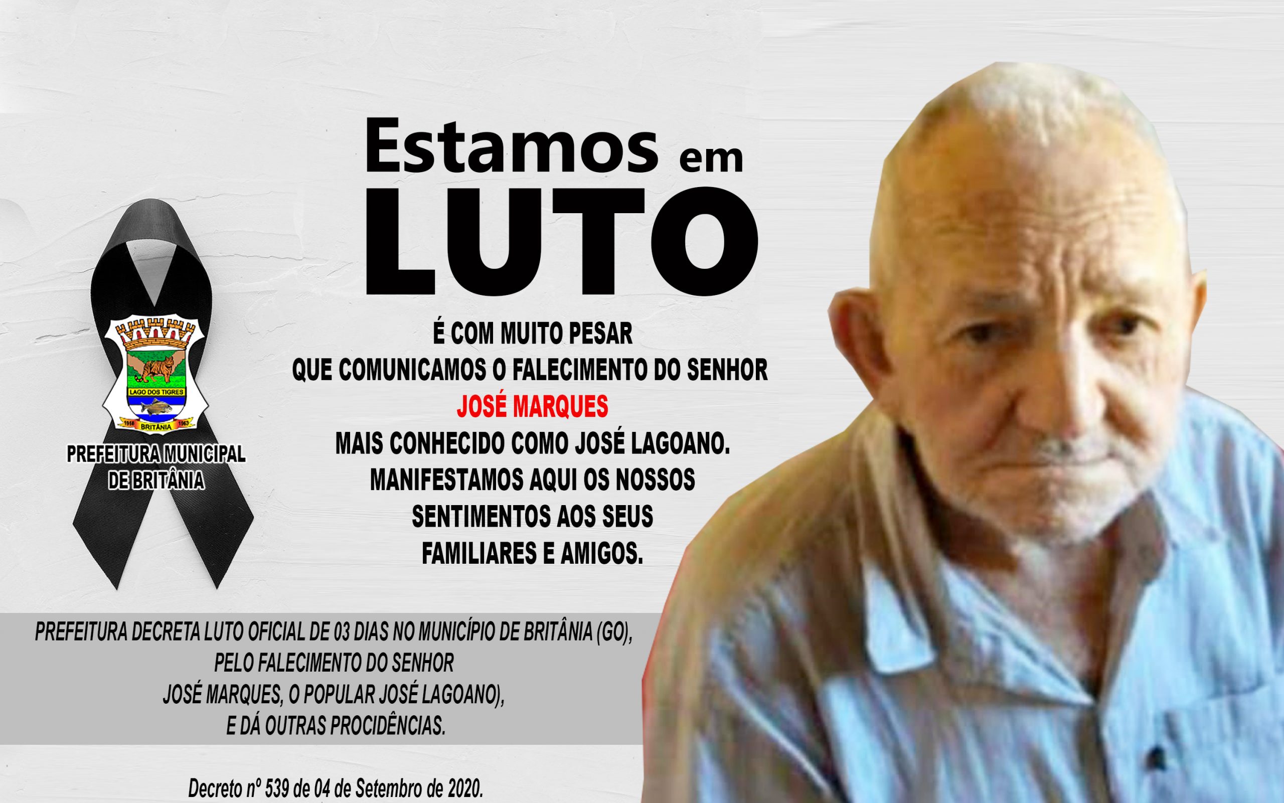 PREFEITURA DECRETA LUTO OFICIAL DE 03 DIAS NO MUNICÍPIO DE BRITÂNIA (GO), PELO FALECIMENTO DO SENHOR JOSÉ MARQUES (MAIS CONHECIDO POR JOSÉ LAGOANO), E DÁ OUTRAS PROCIDÊNCIAS. Decreto nº 539 de 04 de Setembro de 2020.