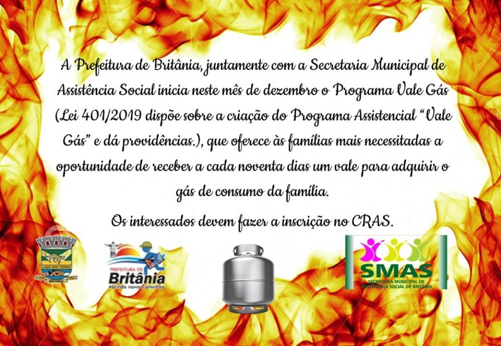 A PREFEITURA DE BRITÂNIA, JUNTAMENTE COM A SECRETARIA MUNICIPAL DE ASSISTÊNCIA SOCIAL INICIA NESTE MÊS DE DEZEMBRO, O PROGRAMA VALE GÁS (Lei 401/2019 – Dispõe sobre a criação do Programa Assiatencial “VALE GÁS e dá providencias), QUE OFERECE ÀS FAMÍLIAS MAIS NECESSITADAS A OPORTUNIDADE DE RECEBER A CADA NOVENTA DIAS UM VALE PARA ADQUIRIR O GÁS DE CONSUMO DA FAMÍLIA.