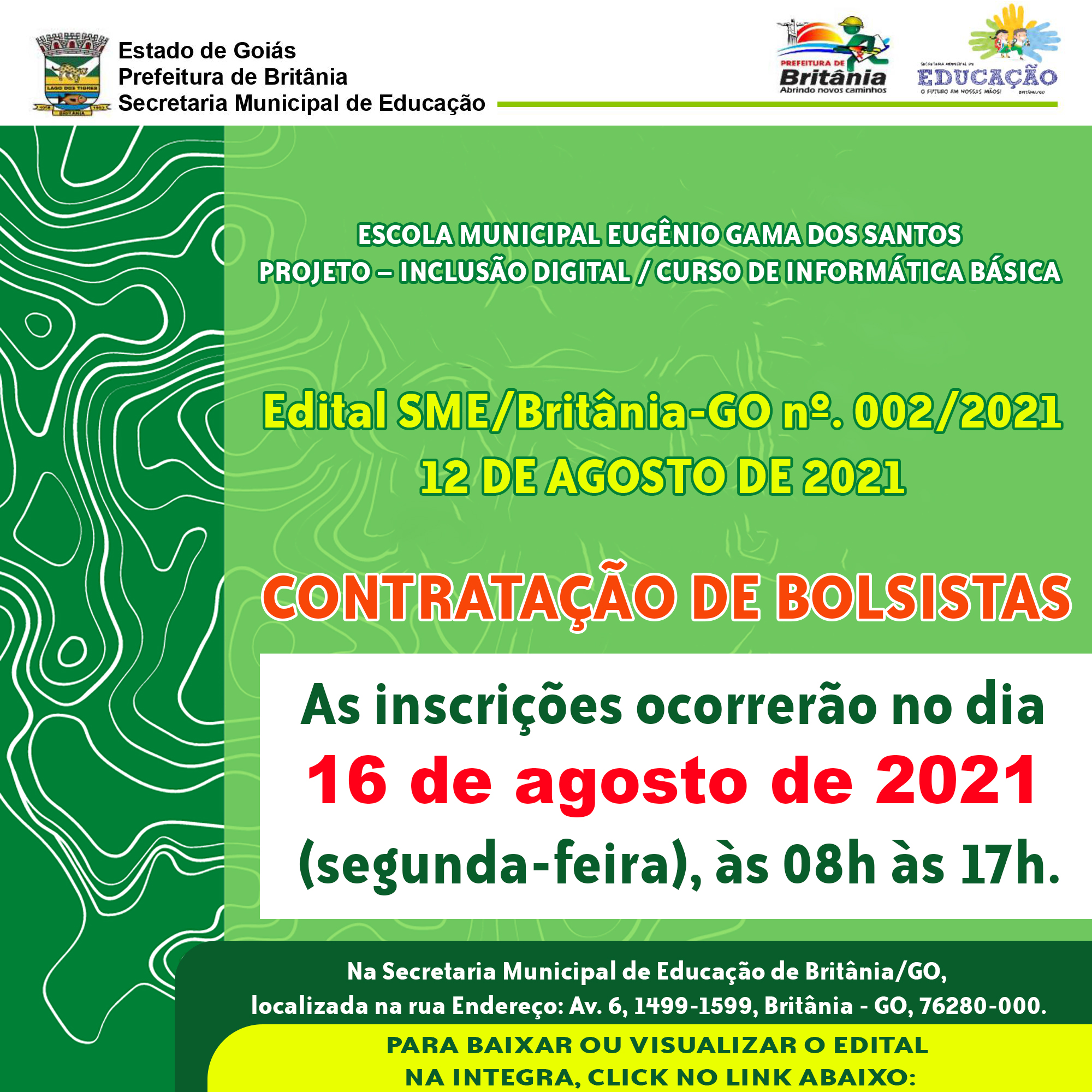 As inscrições ocorrerão no dia 16 de agosto de 2021 (segunda-feira), às 08h às 17h, na Secretaria Municipal de Educação de Britânia/GO, localizada na rua Endereço: Av. 6, 1499-1599, Britânia – GO, 76280-000.