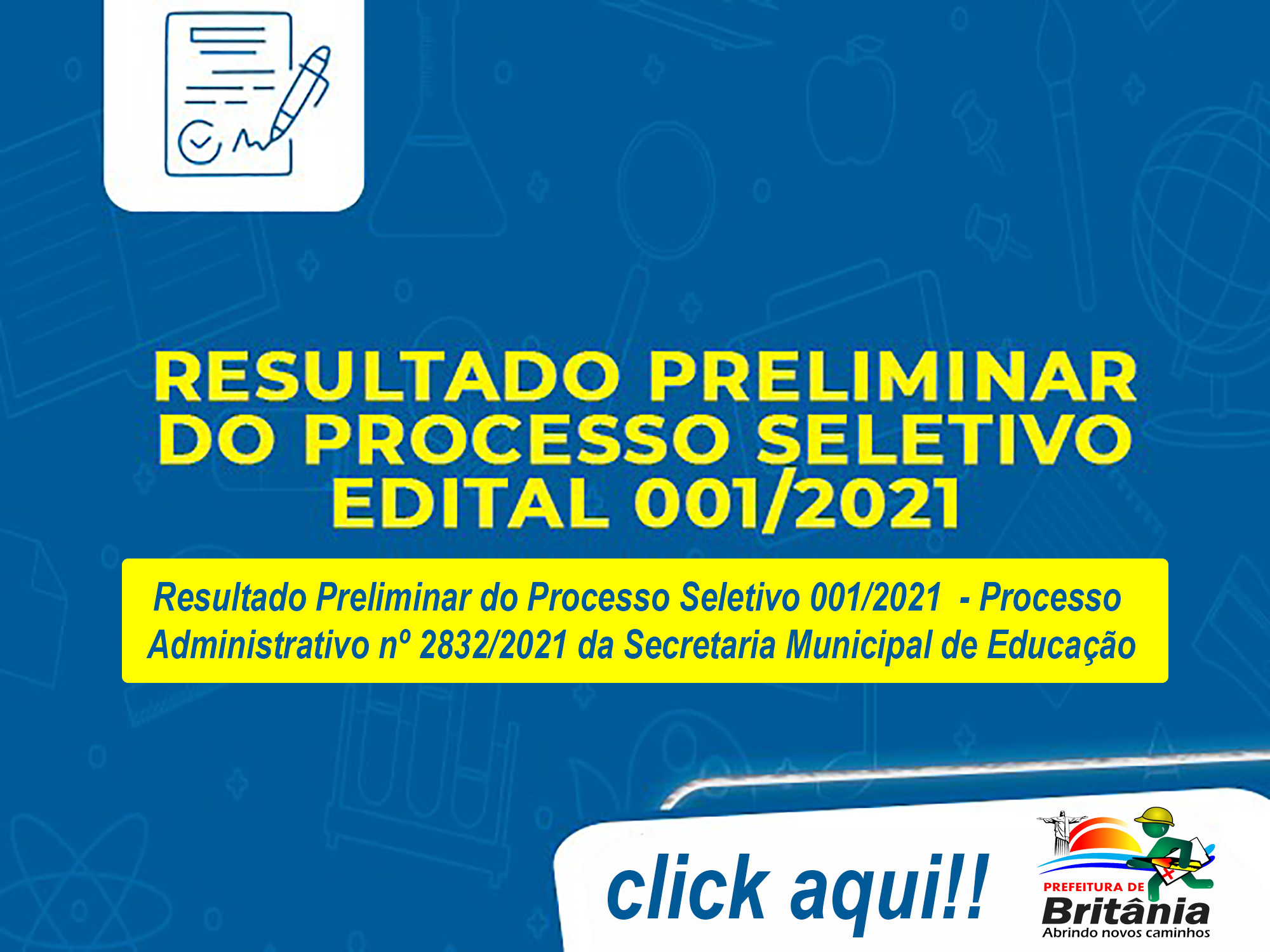 Resultado Preliminar do Processo Seletivo 001/2021 da Secretaria Municipal de Educação / Britânia GO